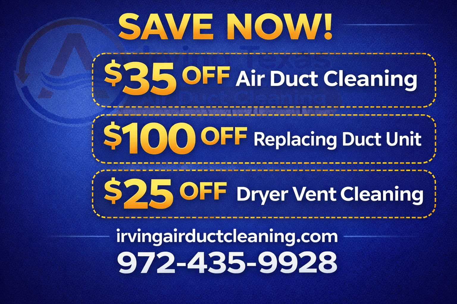 Get great deals on professional air duct cleaning in Irving for a limited time. These deals will help your home's air quality while keeping your costs low.